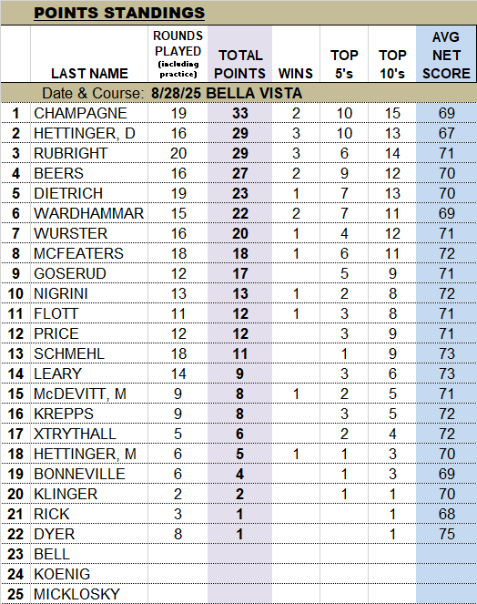 For the final 5 rounds of championship play the points will be 11 for the winner, 9 pts for 2nd, 8 for 3rd, etc to 1 pt for 10th. All weeks count. We will not do "best of" like we did last year, using 3 of best 5 championship rounds. This year's spreadsheet is not setup for that.