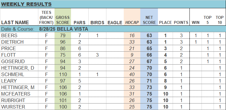 We had a nice even 12 Duffers play the Vista, and all 12 got points. Rubright, McFeaters, and Wurster tied for 10th at 75.